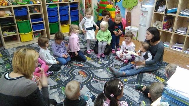 Dzieci z uwagą wysłuchali jesiennej opowieści, a następnie wspólnie z gościem pośpiewały piosenki o wiewióreczce i starym kasztanie.