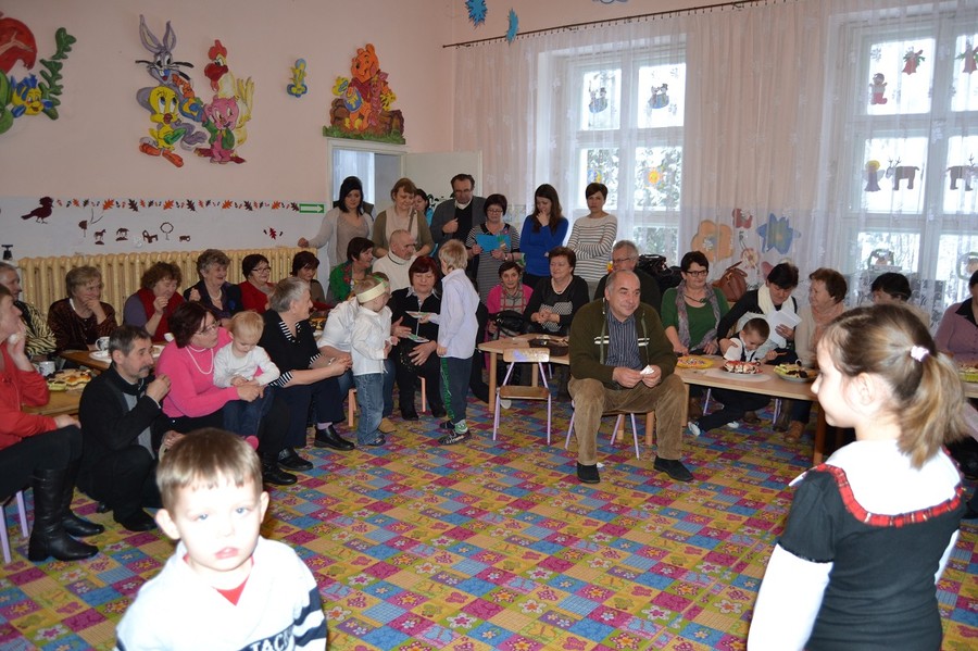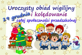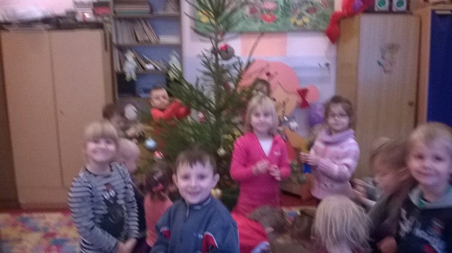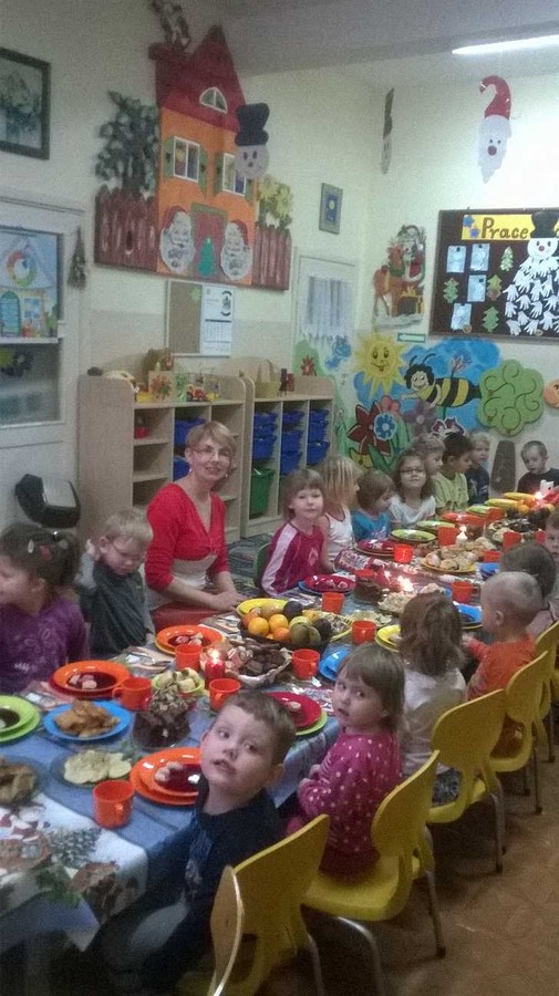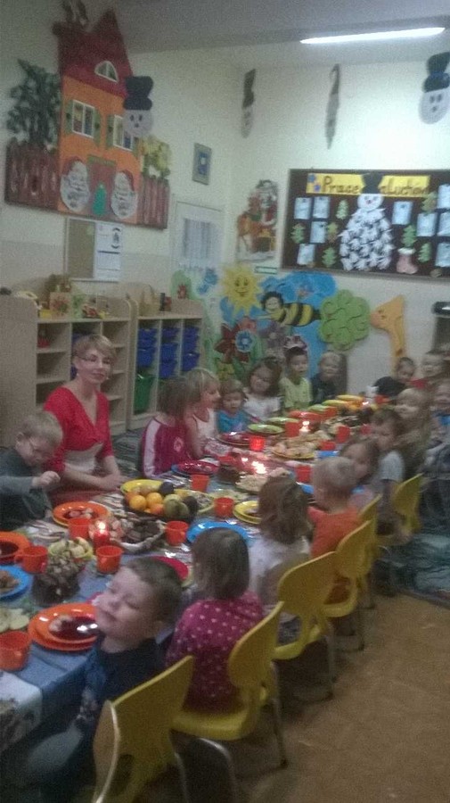 Świąteczny nastrój zapanował w przedszkolu 19 grudnia, kiedy to dzieci i wszyscy pracownicy przedszkola spotkali się na wspólnej Wigilii. Wspaniałym momentem było dzielenie się opłatkiem, składanie sobie świątecznych życzeń i śpiewanie kolęd. Dzieci smakowały barszczyk z uszkami, pierogi z kapustą i grzybami, rybę smażoną, krokiety i paszteciki z pieczarkami oraz inne smakołyki.
