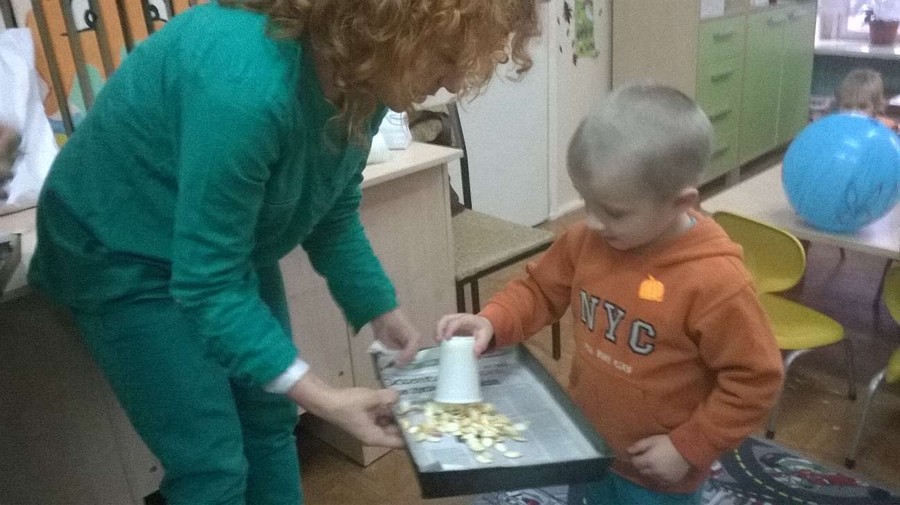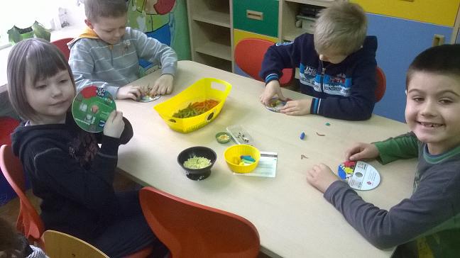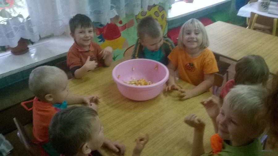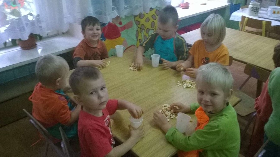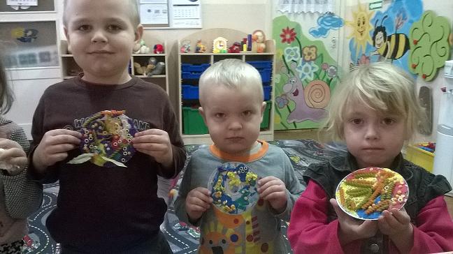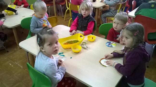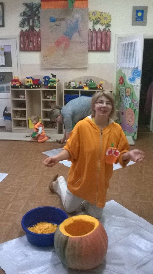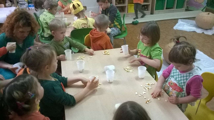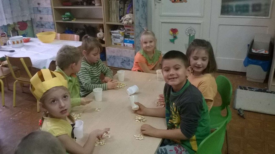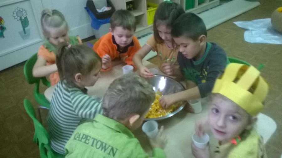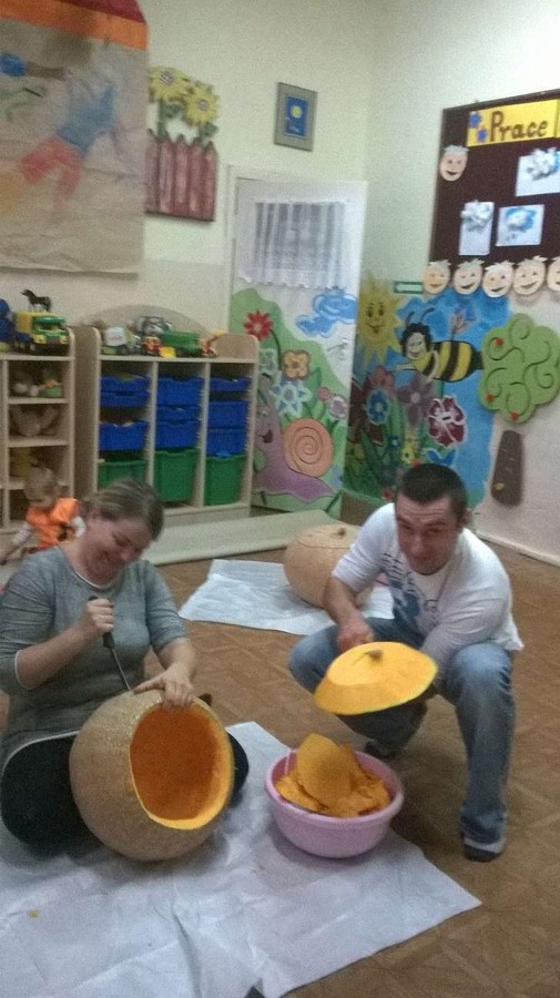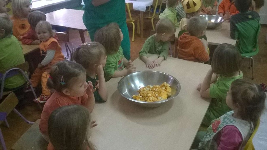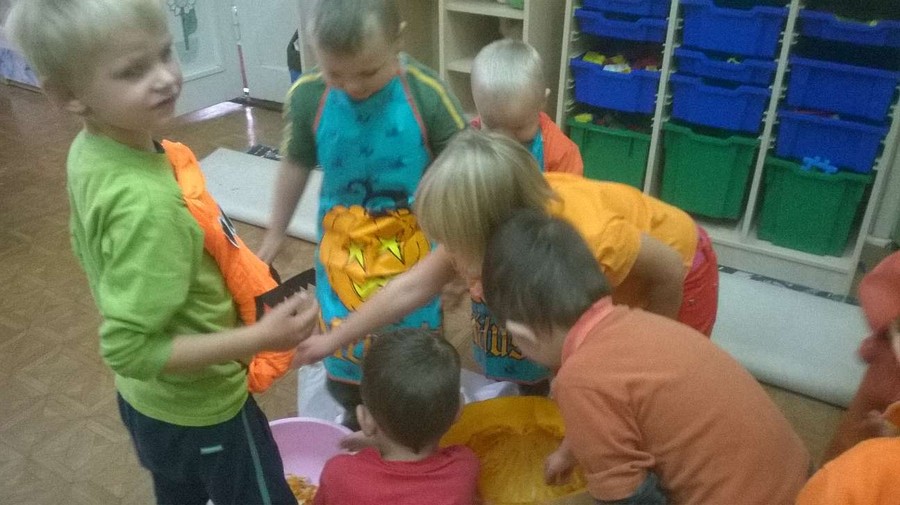 Dzieci wspólnie z Paniami na zajęciach wykonywały piękne prace plastyczne – dynię wypełnioną kulkami z bibuły, malowanie pastelami dyni, wyklejanki z bibuły. Jednak najwięcej przyjemności sprawiło im badanie zawartość dyni. Dzięki pomocy naszym wspaniałym rodzicom, którzy obdarowali nas tymi jesiennymi warzywami i pomogli w przeprowadzeniu zajęć z udziałem dyni, dzień był pełen wrażeń. Przedszkolacy dowiedzieli się z obserwacji, co kryje w środku dynia i skąd się biorą pestki, jakie pyszności można zrobić z dyni oraz jak ozdobić dynię. Sami wyjmowali pestki ze środka, po czym wykorzystaliśmy je do przeliczania podczas zajęć. Były też pyszne placuszki z dyni, które smakowały wyśmienicie. Natomiast na podwieczorek było smaczne ciasto marchewkowe upieczone przez jedną z naszych super mam!!!! Dziękujemy Wam bardzo za wszelką pomoc!!!