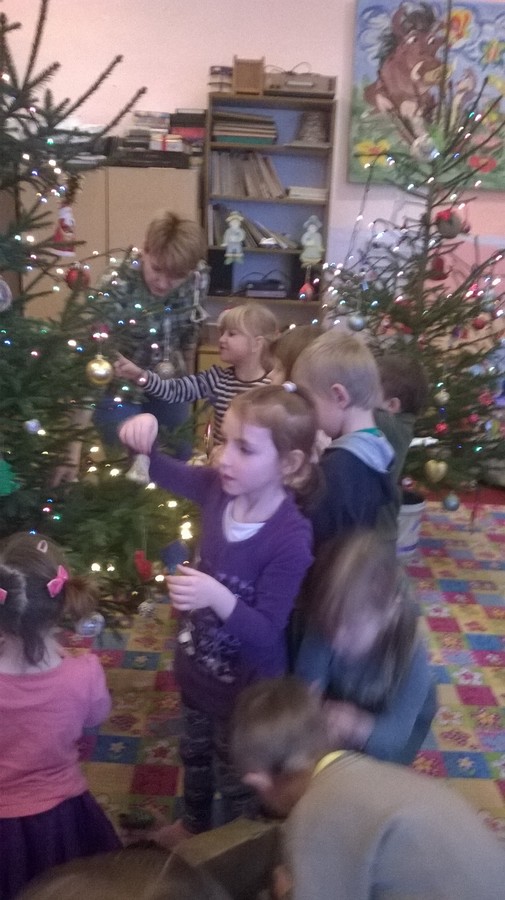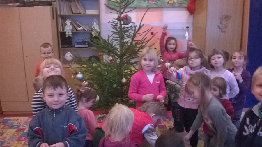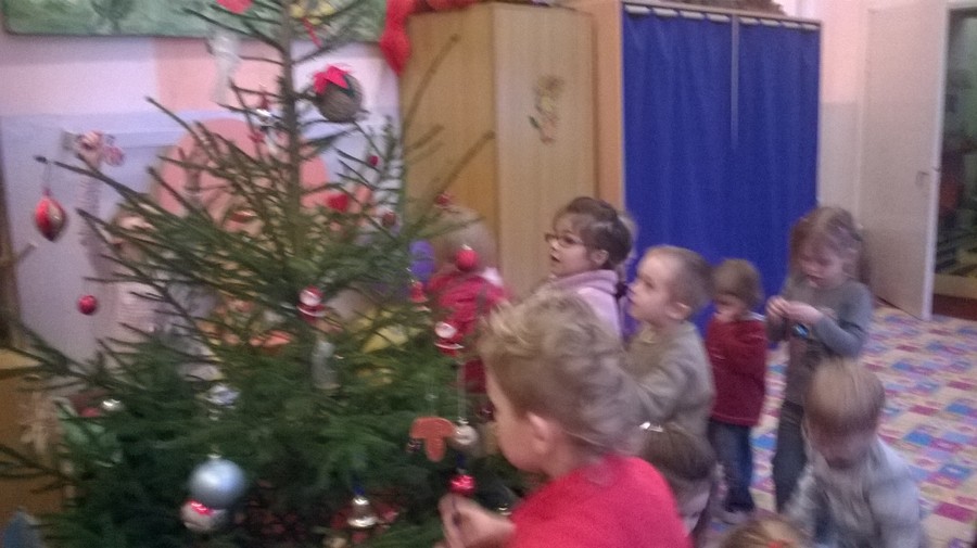 Dzięki naszym wspaniałym ozdobom nasza choinka wygląda prześlicznie. Wiszą na niej nasze gwiazdki, bombki, łańcuchy. Na szczycie umieściliśmy dużą gwiazdę betlejemską. Mamy nadzieję, że choinka wszystkim się spodoba, gdyż przyozdobiliśmy ją samodzielnie. Dzieci podchodziły i ubierały choinkę z dużym zaangażowaniem i przejęciem.