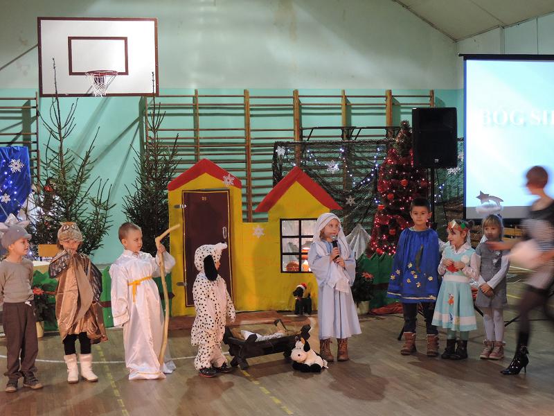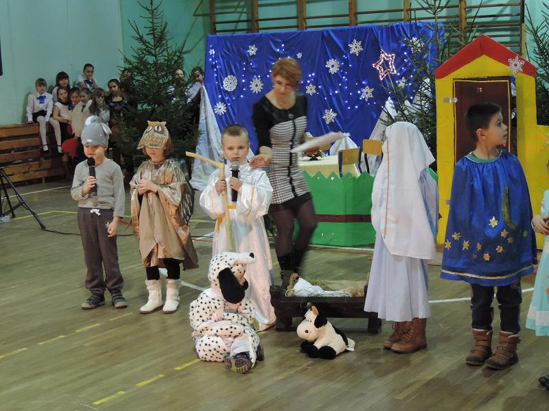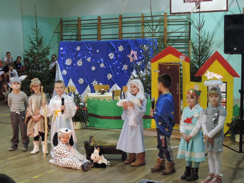 Reprezentanci przedszkola w Rozogach „SŁONECZKO” miały zaszczyt i przyjemność rozpocząć ten uroczysty i przyjemny wieczór prezentując swoje Jasełka Bożenarodzeniowe p.t.” Zwierzątka w drodze do Betlejem”. Występ dla naszych małych artystów był pierwszym wystąpieniem poza terenem przedszkola i dla tak dużej publiczności. Jednak mamy nadzieję, że nie ostatnim.
